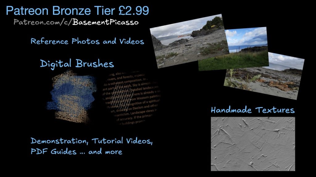 My latest brushes are now available on Patreon starting with a Bronze tier from only £2.99 per month. I post new content every month including reference videos, demonstrations, brushes and other digital assets. I also offer one-to-one coaching and mentorship.