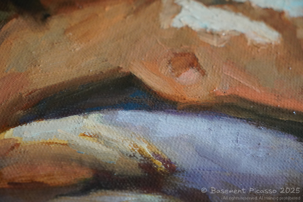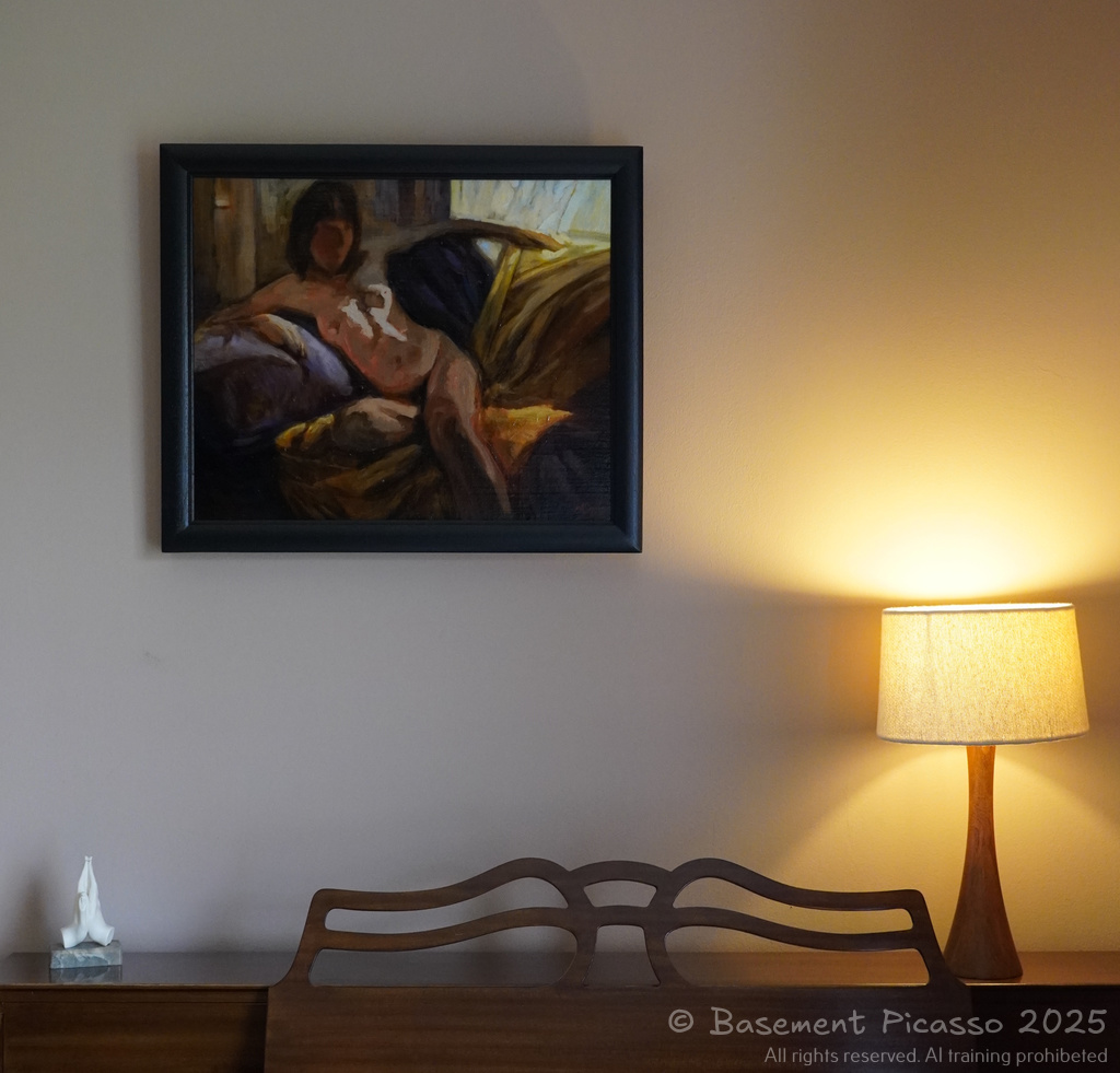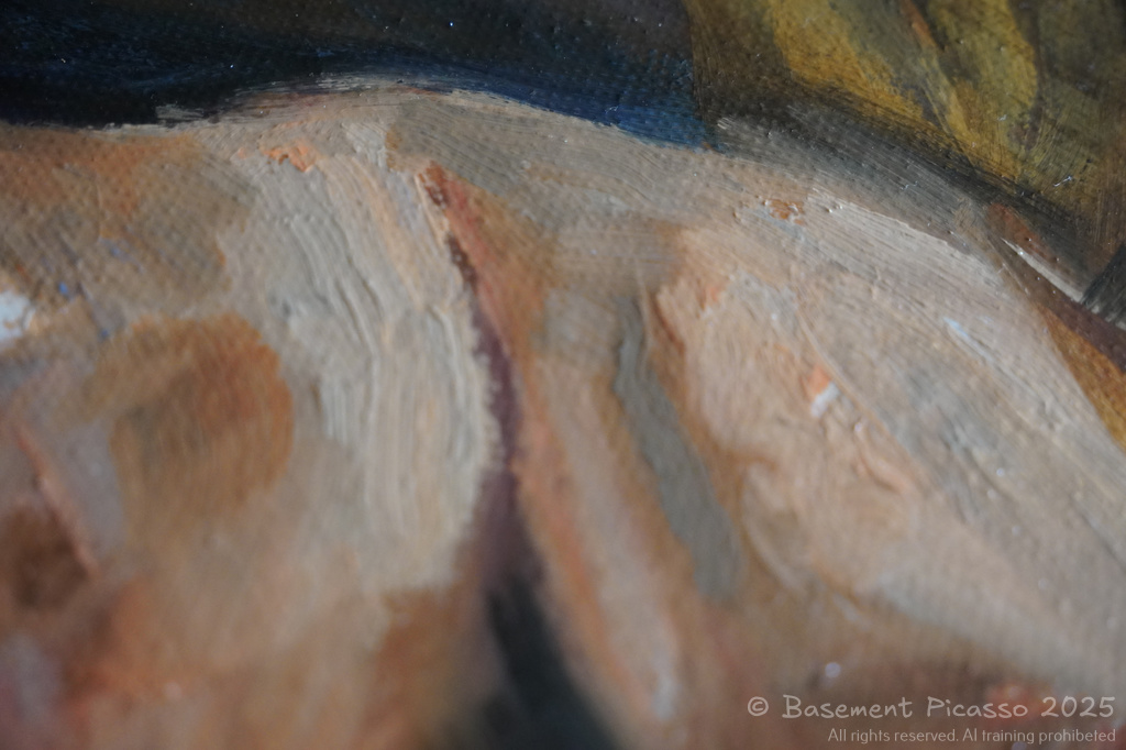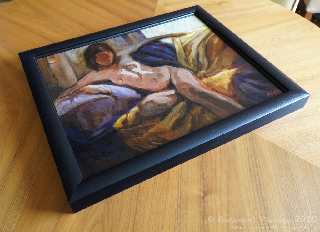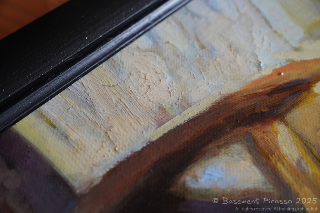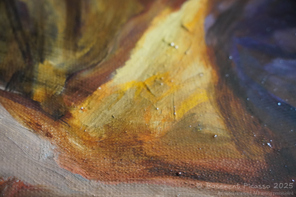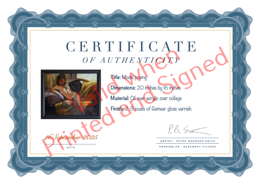 An original oil painting measuring 20 inches wide by 16 inches tall. It is oil over acrylic over collage on a wooden panel. Finished with 2-3 coats of Gamvar archival gloss varnish. Provided with a signed certificate of authenticity. The painting is provided framed as shown, with wire fitted, ready to hang (but does not include picture hooks).